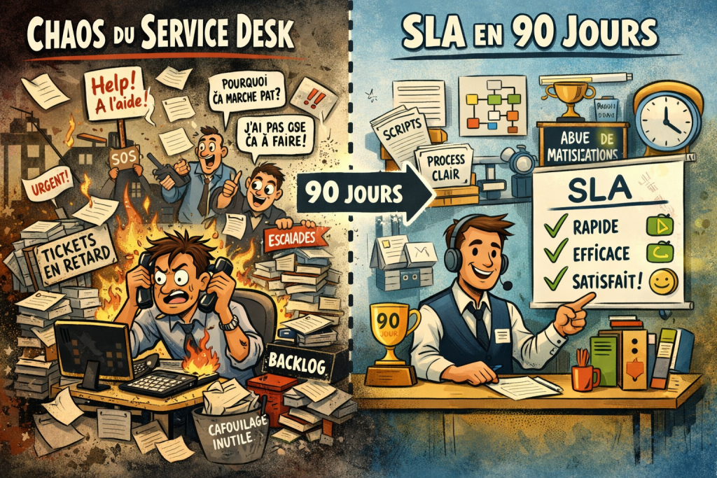 La bonne nouvelle, c’est qu’un redressement est possible, vite, si l’on accepte une vérité simple : un Service Desk performant n’est pas une addition d’outils et de bonne volonté. C’est un système. Et un système, ça se conçoit, ça s’industrialise, ça se pilote. Objectif : passer du chaos à une promesse tenue — des SLA crédibles — en 90 jours. Pas en “transformant” l’entreprise, mais en remettant l’essentiel à sa place : l’organisation, les scripts, l’outillage, et le pilotage.