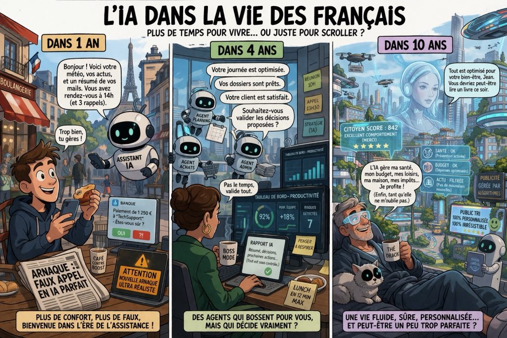 Ce qui se prépare n’a donc rien d’abstrait. Ce n’est pas seulement une bataille entre géants de la tech. C’est une transformation concrète de la vie ordinaire. Dans un an, quatre ans, dix ans, le quotidien des Français ne sera pas bouleversé de la même manière ni au même rythme. Mais une tendance se dessine déjà : plus de fluidité, plus d’automatisation, plus de personnalisation, et en même temps plus de contrôle, plus d’opacité et plus de dépendance à des systèmes que très peu comprendront réellement. Cette projection s’appuie sur les tendances relevées par l’OCDE sur l’IA et le travail, sur les analyses du Forum économique mondial sur la transformation des compétences et des emplois, et sur les signaux très clairs envoyés par le marché technologique.