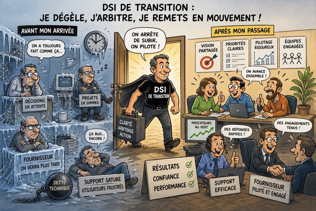 C’est précisément dans ce type de contexte qu’intervient un DSI de transition. Non pas pour « tenir la boutique » quelques mois, ni pour produire une nouvelle série de comités et de tableaux de bord, mais pour remettre du mouvement là où les circuits de décision, les responsabilités et les priorités se sont progressivement bloqués. Son rôle n’est pas seulement technique. Il est managérial, opérationnel, politique au sens noble du terme, et profondément stratégique.