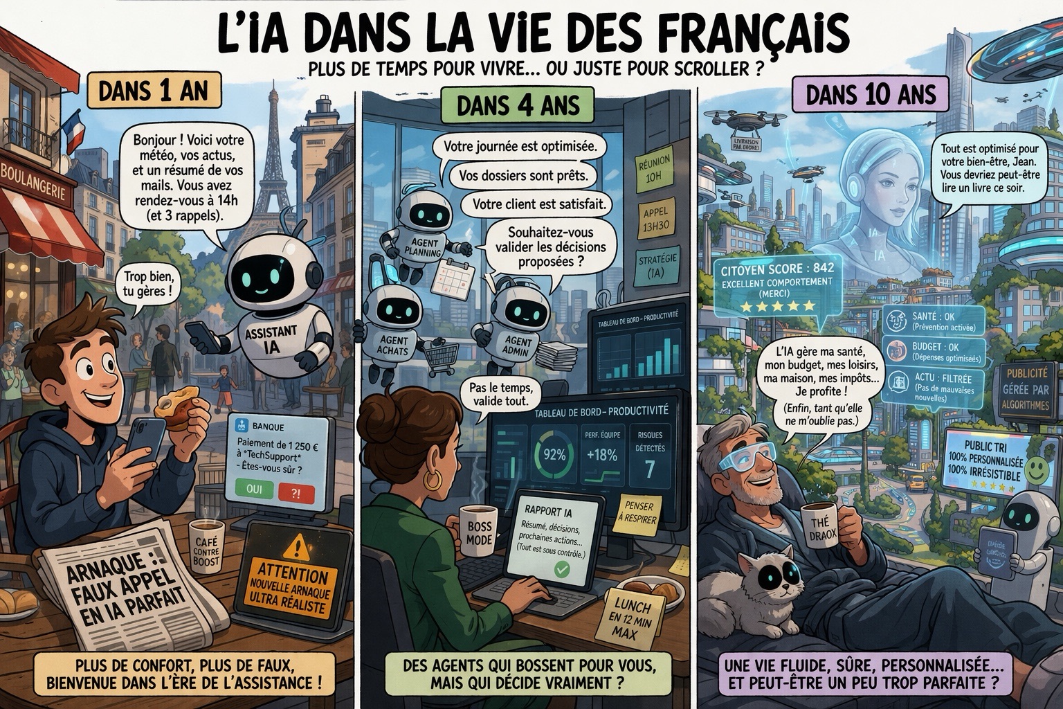 Dans un an, quatre ans, dix ans, l’intelligence artificielle va transformer le quotidien des Français bien au-delà des écrans : travail, services, sécurité, consommation, démarches et décisions seront de plus en plus assistés, automatisés et pilotés par des agents numériques. Derrière les promesses de confort et de rapidité, c’est une nouvelle société plus fluide, mais aussi plus contrôlée, qui prend forme. … Read More