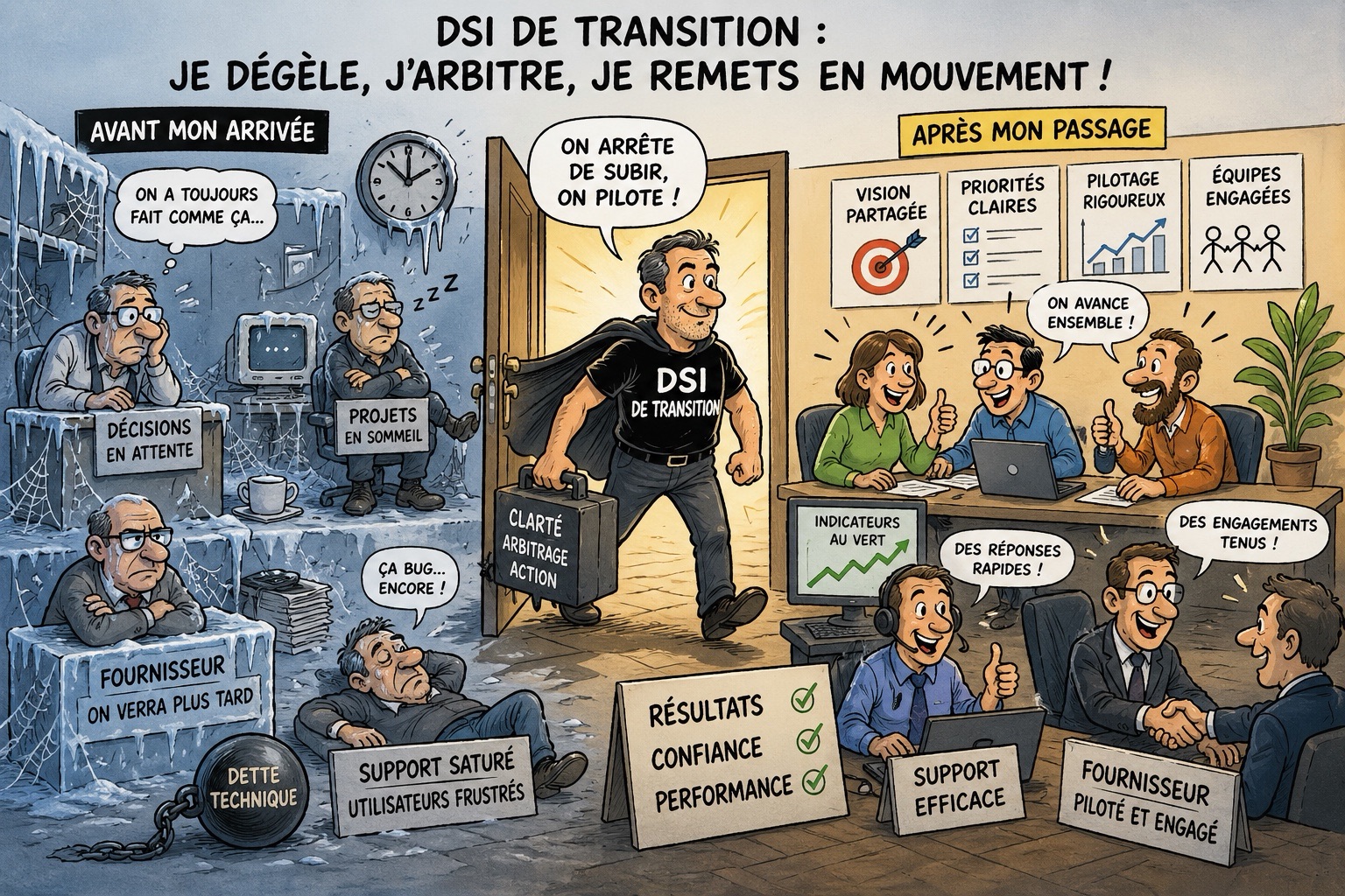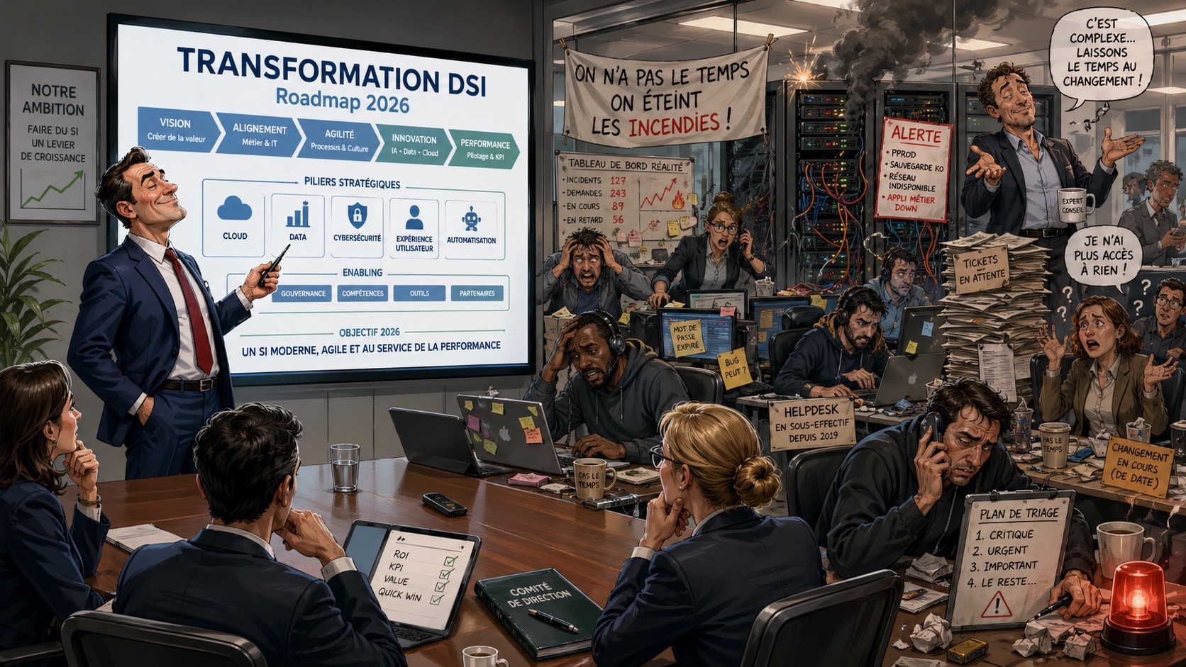 Un PowerPoint peut raconter une ambition. Il ne transforme pas une DSI. La vraie transformation IT commence quand il faut décider, arbitrer, piloter, corriger et remettre l’organisation en mouvement. … Read More