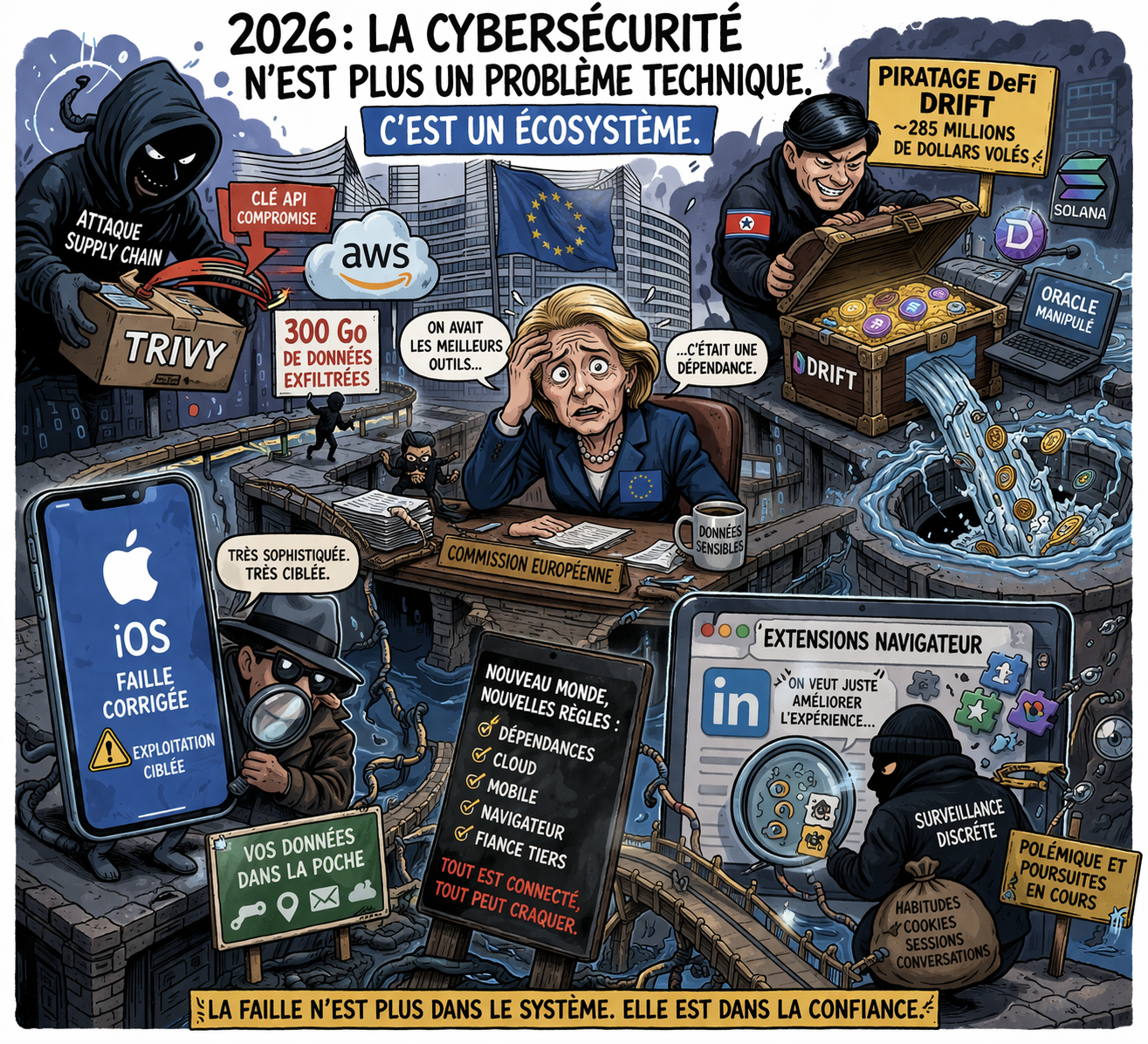 Attaque supply chain à la Commission européenne, hack DeFi de Drift, failles iOS et polémique sur les extensions LinkedIn : pourquoi la multiplication des incidents majeurs montre que la cybersécurité de 2026 est devenue une crise systémique. … Read More